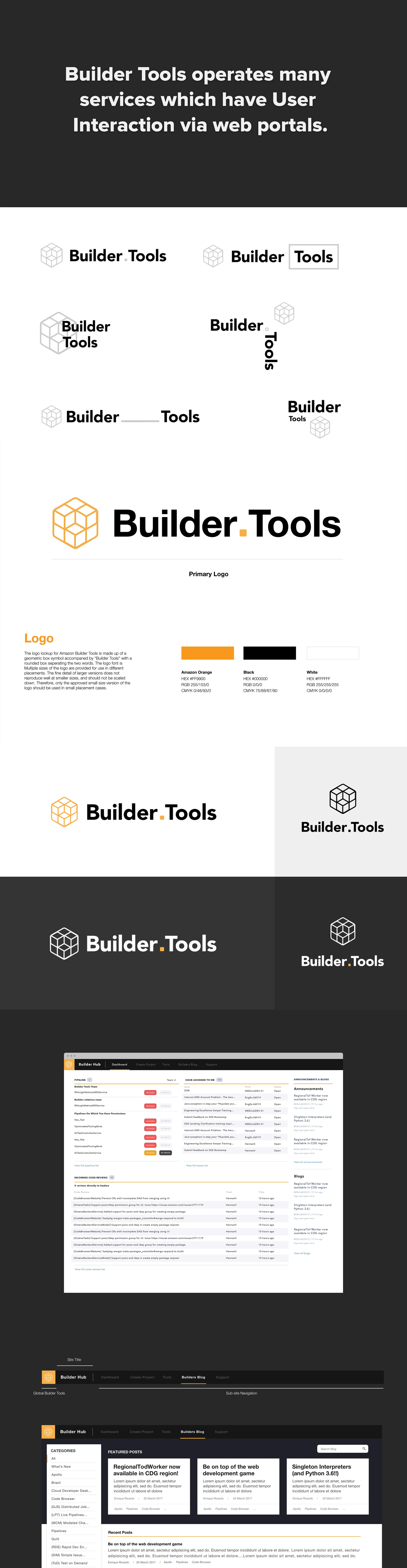 Amazon builder tools provide support and resources for thousands of developers across the company. The main problem that ABT was under going was consistency of their identity and brand within Amazon. Their sub-sites and resources varied in design and carried multitudes of patterns that made users feel like each site sat outside the Builder Tools umbrella. I helped create a standards manual and an updated navigation pattern that allowed users to navigate through the tools and resources without a disconnected feeling. After user reviews, wireframes, branding exercises and visual designs, Builder tools finally felt like one consistent group.